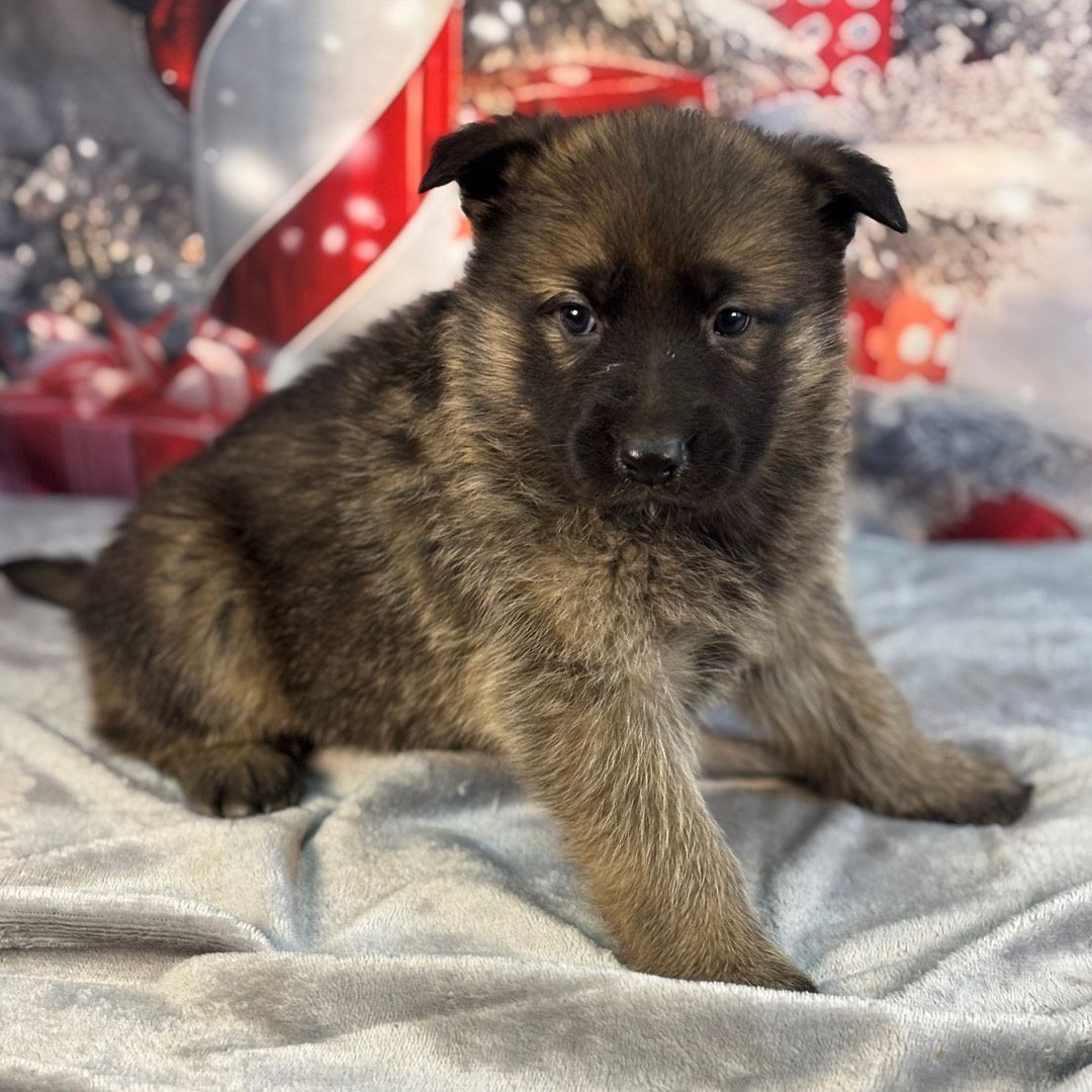EMMY is a beautifully masked girl.Her eyes ar e almost black too, making her very beautiful and classy to look at! Her undercoat is plush. She is being raised with children, other dogs,She is familiar with and using a dogie door.Call today if you are ready to bring this little girl to her new home.